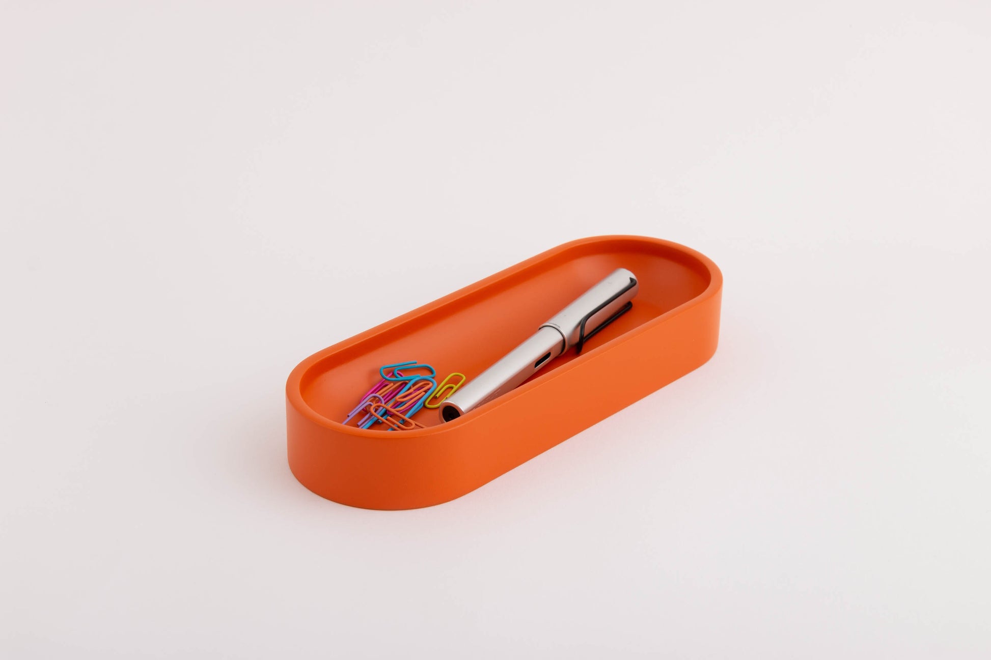 Give your office a modern and colorful look with this orange oval pen tray! Iulia's wooden pen rest is a great addition to your desk. It is a great bed for fountain pens! This desk organizer will make your desk tidy and elegant. This wood pencil tray stores all small stationery items on your desktop. It can be used as a trinket dish as well. It is a great new job gift for loved ones!