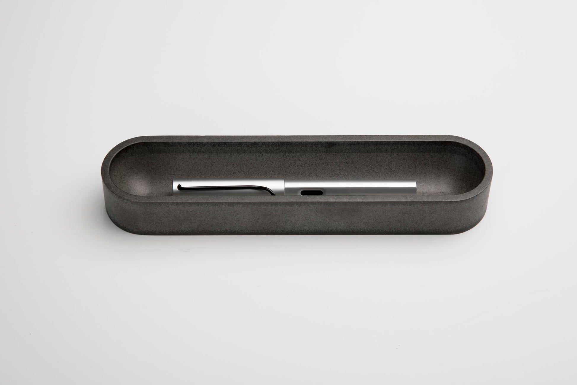 The Gray Oval Pen Tray is fashioned from grey Valchromat, colored engineered wood, with a matte finish.