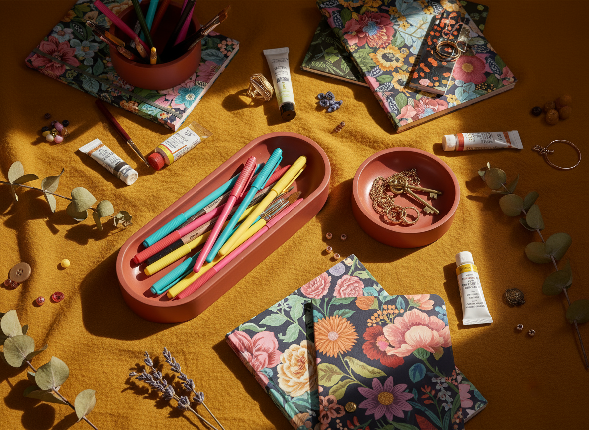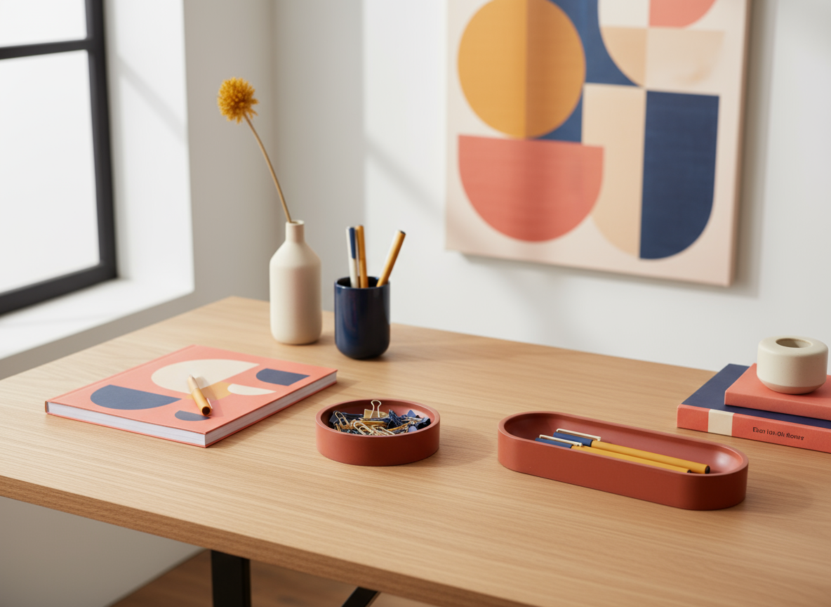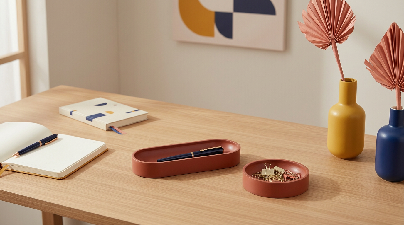 Modern ve renk odaklı çalışma alanları için tasarlanmış, zarif iki parçalı masa düzenleyici seti. Cesur terakota tonu ve temiz geometrik çizgileriyle her masaya sıcak ama sade bir hava katıyor; kalemleri, klipsleri veya mücevherleri düzenlerken sanatsal bir denge sağlamak için mükemmel.