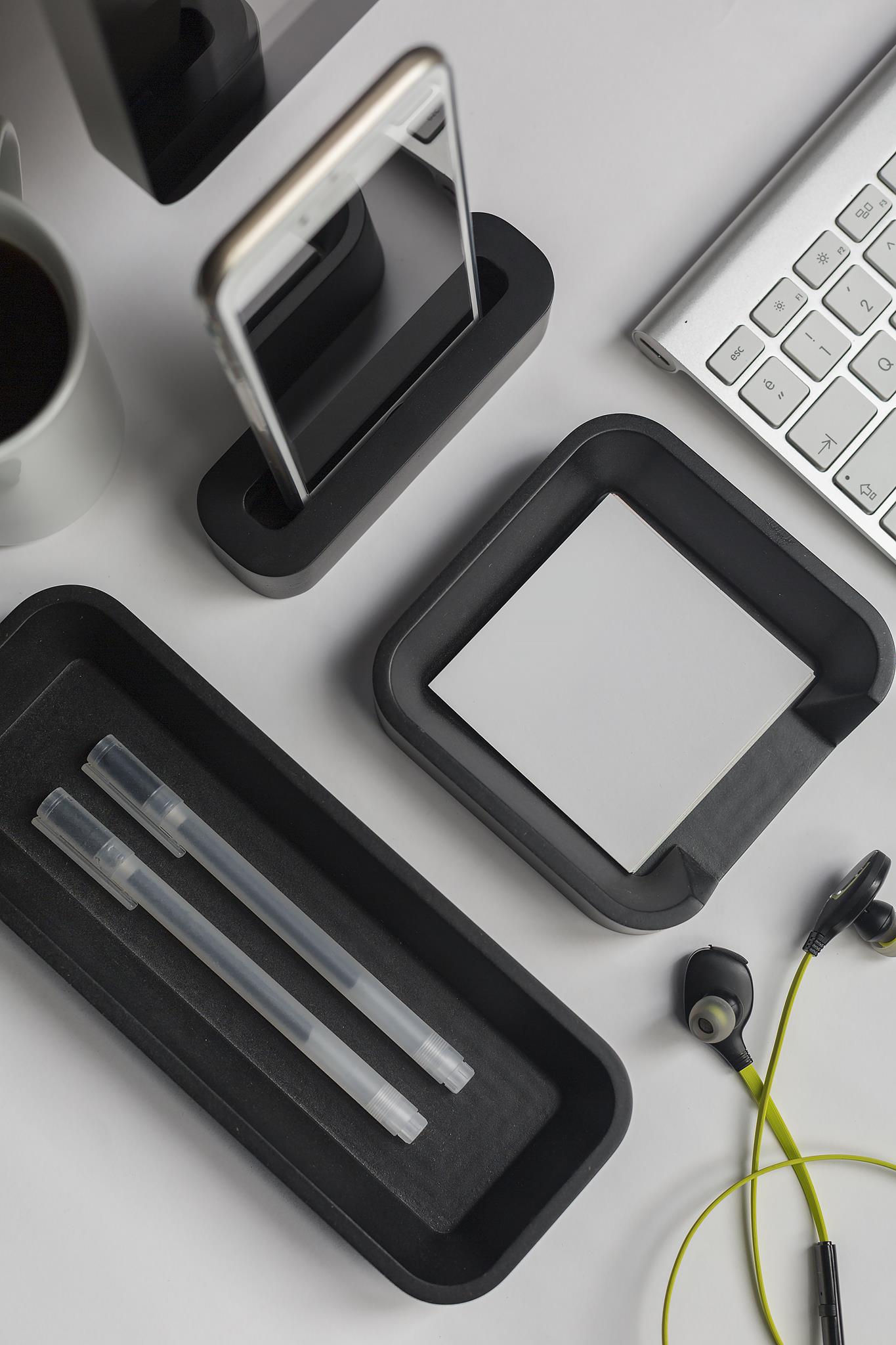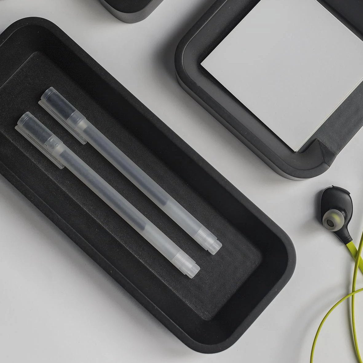 Bu siyah kalemlik, renkli işlenmiş ahşaptan üretilen siyah Valchromat'tan üretilmiştir. Masa düzenleyicisine kurşunsuz mat siyah kaplama uygulanmıştır.