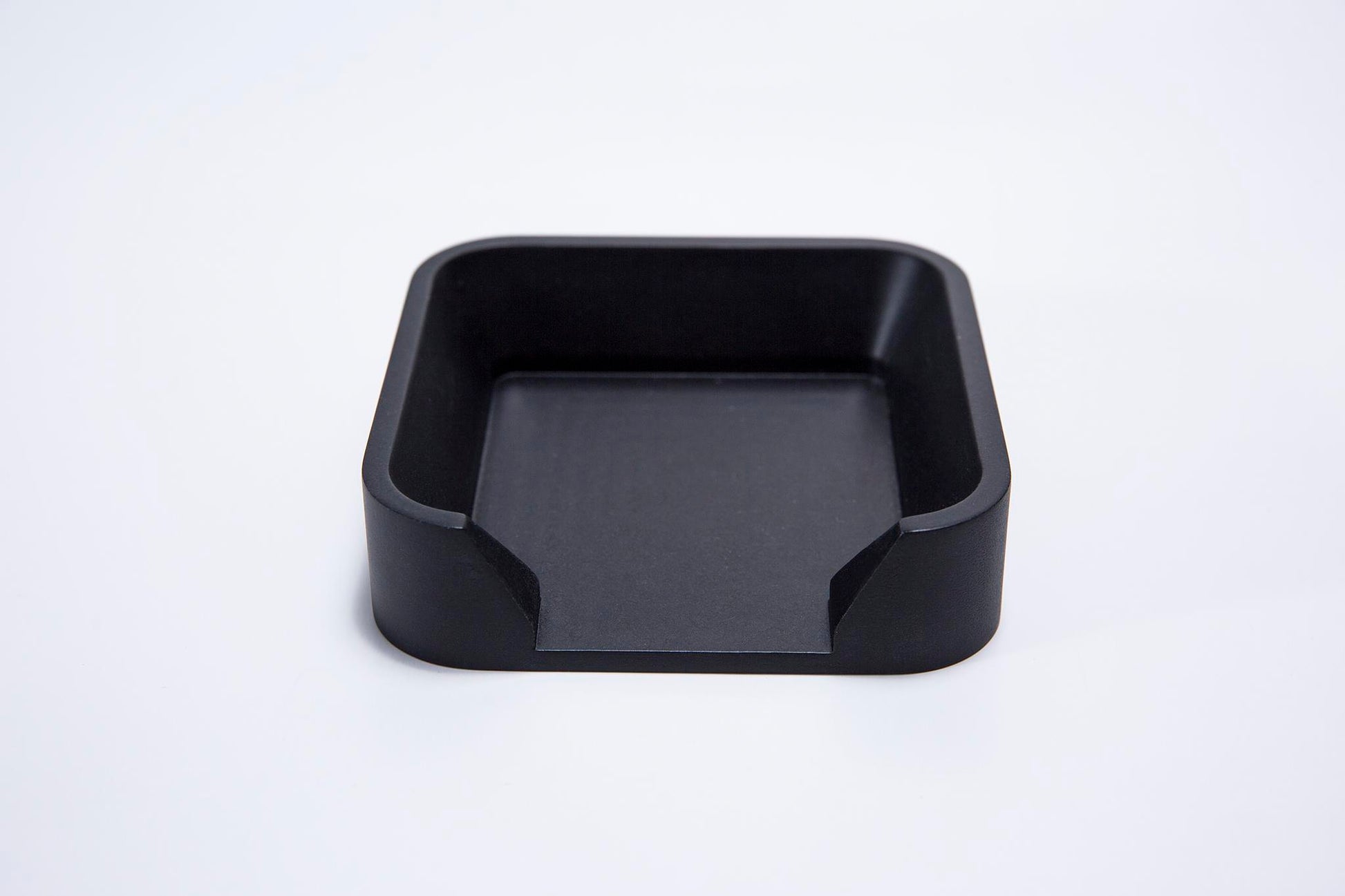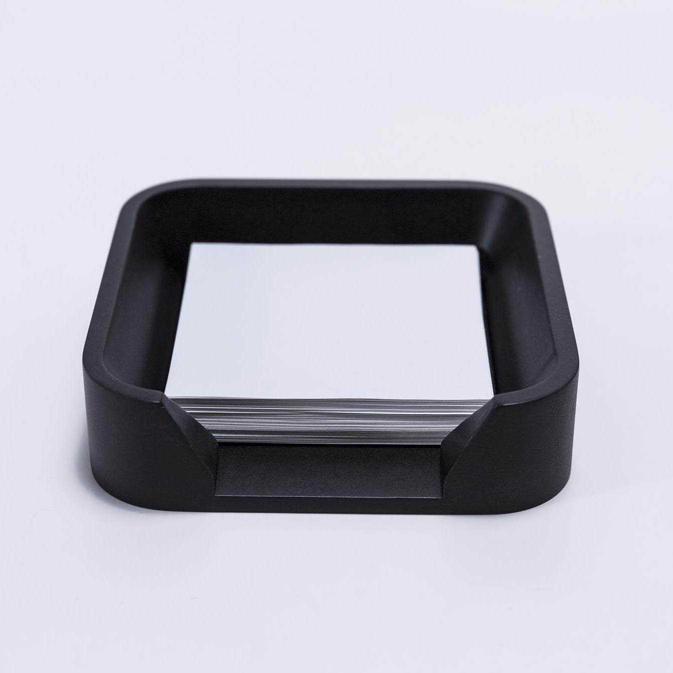 Bu benzersiz siyah not tutucu, siyah Valchromat'tan, renkli işlenmiş ahşaptan ve siyah mat kaplamadan üretilmiştir.